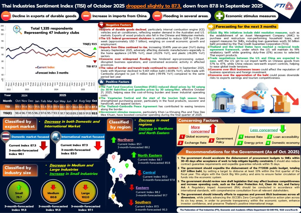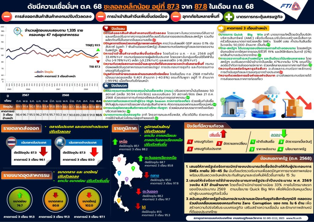 ดัชนีความเชื่อมั่นภาคอุตสาหกรรม ประจำปี 2568 ดัชนีความเชื่อมั่นภาคอุตสาหกรรมเดือนตุลาคม 2568 Estimated reading: 1 minute 62 views ดัชนีความเชื่อมั่นฯ ในเดือนตุลาคม 2568 อยู่ที่ระดับ 87.3 ปรับตัวลดลงเล็กน้อย จาก 87.8 ในเดือนกันยายน 2568 ขณะที่ดัชนีคาดการณ์ 3 เดือนข้างหน้าอยู่ที่ระดับ 93.5 ปรับตัวเพิ่มขึ้น จาก 91.8 ในเดือนกันยายน 2568 เมื่อพิจารณาองค์ประกอบของดัชนีความเชื่อมั่นภาคอุตสาหกรรม ในเดือนตุลาคม 2568 พบว่า องค์ประกอบส่วนใหญ่ปรับตัวลดลง ยกเว้น ต้นทุนการประกอบการ (ผกผัน) ที่ปรับตัวเพิ่มขึ้น ขณะที่ดัชนีคาดการณ์ 3 เดือนข้างหน้า องค์ประกอบส่วนใหญ่ปรับตัวเพิ่มขึ้น ยกเว้น ยอดคำสั่งซื้อจากต่างประเทศ และยอดขายในต่างประเทศปรับตัวลดลง ในเดือนนี้มีปัจจัยลบจาก 1) การส่งออกสินค้าคงทนปรับตัวลดลง 2) ปัญหาการปิดหน่วยงานรัฐบาลกลางสหรัฐฯ 3) การนำเข้าสินค้าจากจีนเพิ่มขึ้นต่อเนื่อง 4) ความกังวลต่อสถานกาณ์น้ำและอุทกภัยในหลายพื้นที่ 5) มูลค่าการค้าชายแดนหดตัวต่อเนื่อง อย่างไรก็ตาม ยังมีปัจจัยบวกจาก 1) กบน. ปรับลดราคาน้ำมันดีเซลลง 50 สตางค์ 2) เทศกาลกินเจและ High Season 3) การบรรลุข้อตกลงสันติภาพระหว่างไทย-กัมพูชา 4) มาตรการคนละครึ่งพลัส และเที่ยวดีมีคืน ดาวน์โหลดไฟล์ข้อมูล ⇓Info ดัชนีฯ ตุลาคม 2568 (คลิก)Info TISI OCT 2025 (คลิก)PPT แถลงข่าวดัชนีฯ ตุลาคม 2568 (คลิก)Paper ดัชนีฯ ตุลาคม 2568 (คลิก) Next - ดัชนีความเชื่อมั่นภาคอุตสาหกรรม ประจำปี 2568 ดัชนีความเชื่อมั่นภาคอุตสาหกรรมเดือนกันยายน 2568