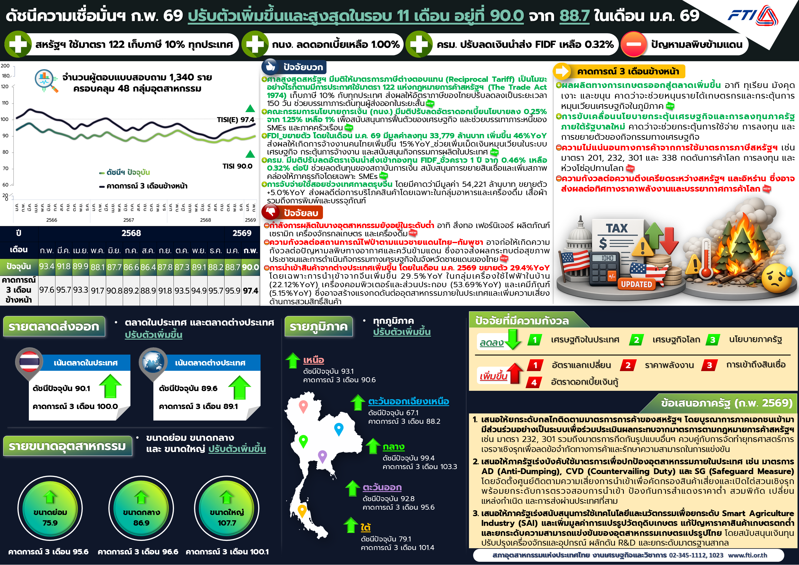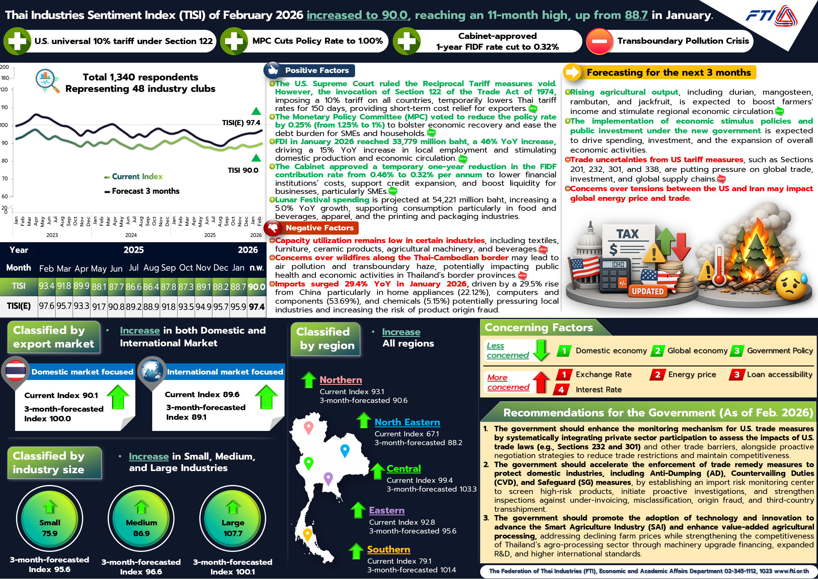 ดัชนีความเชื่อมั่นภาคอุตสาหกรรม ประจำปี 2569 ดัชนีความเชื่อมั่นภาคอุตสาหกรรมเดือนกุมภาพันธ์ 2569 Estimated reading: 1 minute 291 views ดัชนีความเชื่อมั่นฯ ในเดือนกุมภาพันธ์ 2569 อยู่ที่ระดับ 90.0 ปรับตัวเพิ่มขึ้น จาก 88.7 ในเดือนมกราคม 2569 ขณะที่ดัชนีคาดการณ์ 3 เดือนข้างหน้าอยู่ที่ระดับ 97.4 ปรับตัวเพิ่มขึ้น จาก 95.9 ในเดือนมกราคม 2569 เมื่่อพิจารณาองค์ประกอบของดัชนีความเชื่อมั่นภาคอุตสาหกรรม ในเดือนกุมภาพันธ์ 2569 พบว่า องค์ประกอบส่วนใหญ่ปรับตัวเพิ่มขึ้น ขณะที่ดัชนีคาดการณ์ 3 เดือนข้างหน้า องค์ประกอบส่วนใหญ่ปรับตัวเพิ่มขึ้น ในเดือนนี้มีปัจจัยบวกจาก 1) ศาลสูงสุดสหรัฐฯ มีมติให้มาตรการภาษีต่างตอบแทน (Reciprocal Tariff) เป็นโมฆะ อย่างไรก็ตามมีการประกาศใช้มาตรา 122 แห่ง กฎหมายการค้าสหรัฐฯ (The Trade Act 1974) เก็บภาษี 10% กับทุกประเทศ 2) คณะกรรมการนโยบายการเงิน (กนง.) มีมติปรับลดอัตราดอกเบี้ยนโยบายลง 0.25% จาก 1.25% เหลือ 1% 3) การจับจ่ายใช้สอยช่วงเทศกาลตรุษจีน อย่างไรก็ตาม ยังมีปัจจัยลบจาก 1) ความกังวลต่อสถานการณ์ไฟป่าตามแนวชายแดนไทย กัมพูชา 2) การนำเข้าสินค้าจากต่างประเทศเพิ่มขึ้น โดยในเดือน ม.ค. 2569 ขยายตัว 29.4%YoY โดยเฉพาะการนำเข้าจากจีน 3) ก าลังการผลิตในบางอุตสาหกรรมยังอยู่ในระดับต่ า อาทิ สิ่งทอ เฟอร์นิเจอร์ ผลิตภัณฑ์เซรามิก เครื่องจักรกลเกษตร และเครื่องดื่ม ดาวน์โหลดไฟล์ข้อมูล ⇓Info ดัชนีฯ กุมภาพันธ์ 2569 (คลิก)Info TISI FEB 2026 (คลิก)PPT แถลงข่าวดัชนีฯ กุมภาพันธ์ 2568 (คลิก)Paper ดัชนีฯ กุมภาพันธ์ 2569 (คลิก) Next - ดัชนีความเชื่อมั่นภาคอุตสาหกรรม ประจำปี 2569 ดัชนีความเชื่อมั่นภาคอุตสาหกรรมเดือนมกราคม 2569