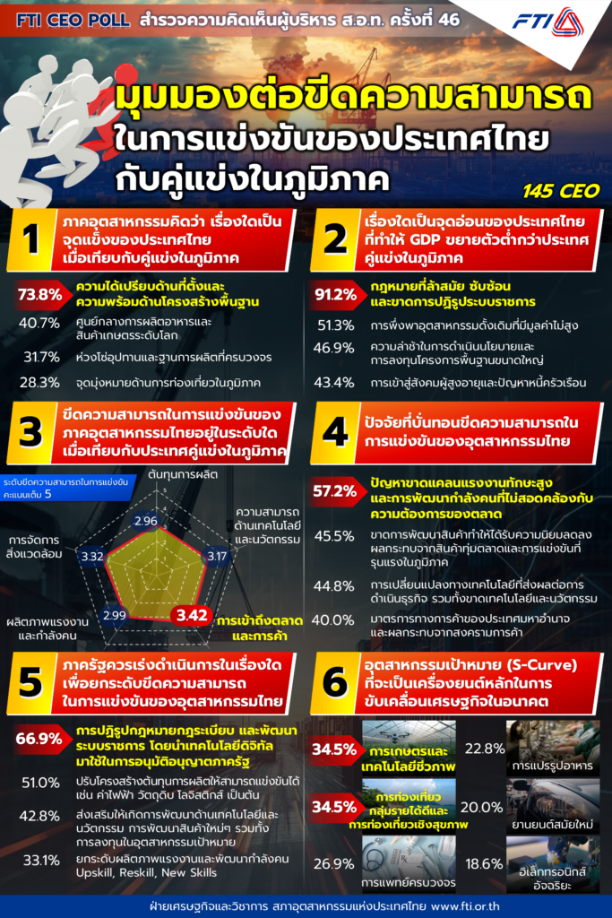 ผลการสำรวจ FTI Poll FTI CEO Poll ครั้งที่ 46 Estimated reading: 1 minute 38 views FTI CEO Poll ครั้งที่ 46 มุมมองต่อขีดความสามารถในการแข่งขันของประเทศไทยกับคู่แข่งในภูมิภาค Next - ผลการสำรวจ FTI Poll FTI CEO Poll ครั้งที่ 45
