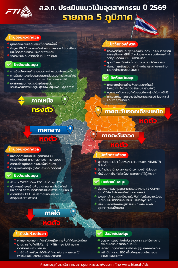 แนวโน้มอุตสาหกรรมไทย แนวโน้ม 48 กลุ่มอุตสาหกรรม 5 ภูมิภาค ปี 2569 Estimated reading: 1 minute 65 views สภาอุตสาหกรรมแห่งประเทศไทย (ส.อ.ท.) ได้ดำเนินการสำรวจความเห็นต่อสถานการณ์และแนวโน้มอุตสาหกรรมจาก 48 กลุ่มอุตสาหกรรม และแนวโน้มอุตสาหกรรมในแต่ละภูมิภาคจาก 5 สภาอุตสาหกรรมภาค เป็นประจำทุกปี โดยมีวัตถุประสงค์เพื่อสะท้อนมุมมองความเห็นและข้อเสนอแนะเกี่ยวกับแนวโน้มอุตสาหกรรม และมีกลุ่มเป้าหมายได้แก่ ประธานกลุ่มอุตสาหกรรม 48 กลุ่มอุตสาหกรรม และประธานสภาอุตสาหกรรมภาค 5 สภาอุตสาหกรรมภาค ในฐานะเป็นตัวแทนสะท้อนมุมมองความเห็นแนวโน้มอุตสาหกรรมในปี 2569 เมื่อเปรียบเทียบกับปีที่ผ่านมา ซึ่งสำรวจความเห็นและรวบรวมข้อมูลในช่วงเดือนตุลาคม-ธันวาคม 2568 สรุปผลการสำรวจแนวโน้มอุตสาหกรรมในปี 2569 พบว่า แนวโน้ม 48 กลุ่มอุตสาหกรรม กลุ่มอุตสาหกรรมที่คาดว่าจะขยายตัวดีขึ้นมีทั้งหมด 15 กลุ่มอุตสาหกรรม กลุ่มอุตสาหกรรมที่คาดว่าจะทรงตัวมีทั้งหมด 23 กลุ่มอุตสาหกรรม และกลุ่มอุตสาหกรรมที่คาดว่าจะหดตัวลงมีทั้งหมด 10 กลุ่มอุตสาหกรรม และสำหรับแนวโน้มอุตสาหกรรมใน 5 ภูมิภาค โดยอุตสาหกรรมในภูมิภาคเหนือคาดว่าจะทรงตัว ในขณะที่อุตสาหกรรมในภูมิภาคตะวันออกเฉียงเหนือ ภาคตะวันออก ภาคกลาง และภาคใต้ คาดว่าจะหดตัวลง ซึ่งสะท้อนถึงความกังวลต่อปัจจัยทางเศรษฐกิจในปีหน้าที่คาดว่าจะยังมีความผันผวนและมีความไม่แน่นอน ดาวน์โหลดไฟล์ข้อมูล ⇓ รายงานแนวโน้ม 48 กลุ่มอุตสาหกรรม 5 ภูมิภาค ปี 2569 (คลิก)Info แนวโน้มอุตสาหกรรม 2569_48 กลุ่มอุตสาหกรรม_Final (คลิก)Info แนวโน้มอุตสาหกรรม 2569_5 ภูมิภาค_Final (คลิก)Info ภาพรวมแนวโน้มอุตสาหกรรม 2569_กลุ่มอุตฯ ภูมิภาค (คลิก) แนวโน้มอุตสาหกรรมราย 48 กลุ่มอุตสาหกรรม แนวโน้มอุตสาหกรรม ราย5ภูมิภาค Next - แนวโน้มอุตสาหกรรมไทย แนวโน้ม 47 กลุ่มอุตสาหกรรม 5 ภูมิภาค ปี 2568